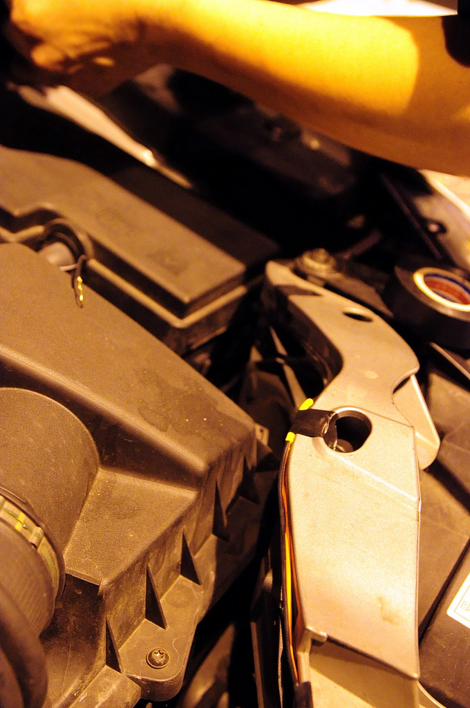 moce柳丁 說,看來看去 Focus 沒有什麼螺絲孔可以穿線,就只好沿著這個鋼樑慢慢走到電瓶那兒: