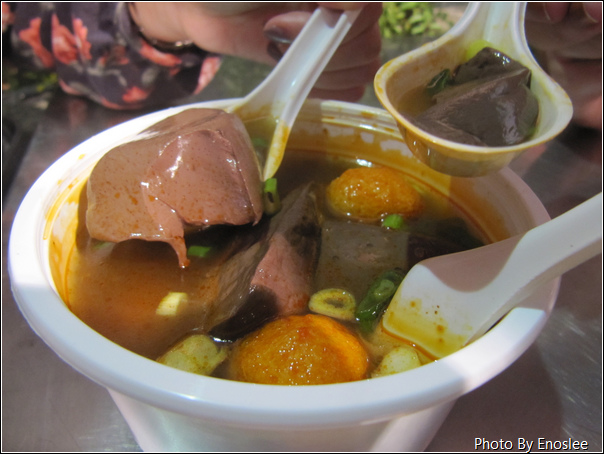 這算是第一次到台南好好的逛逛吧! 白天逛了許多景點之後,晚上當然就以遠近馳名的台南最大夜市-花園夜市作為終點站囉! 本篇就簡單的紀錄一下這晚吃了些什麼,還有感覺受騙的一件事情。由於我們時間拿捏的剛好,在晚間六七點之間就先抵達夜市了,這時候車好停,人也還不是那麼多,還算好走。我們打算以S型走法,兩人一組的合吃法,把夜市每一攤從頭逛到尾,所以入口處的第一攤就是~