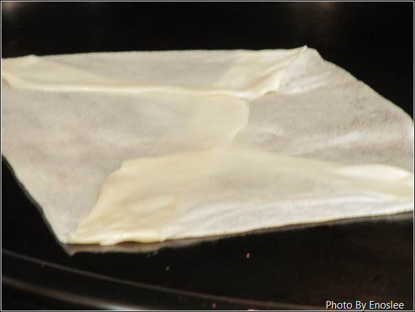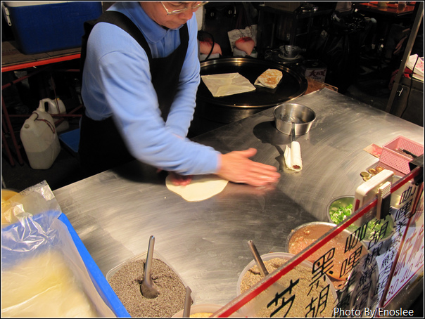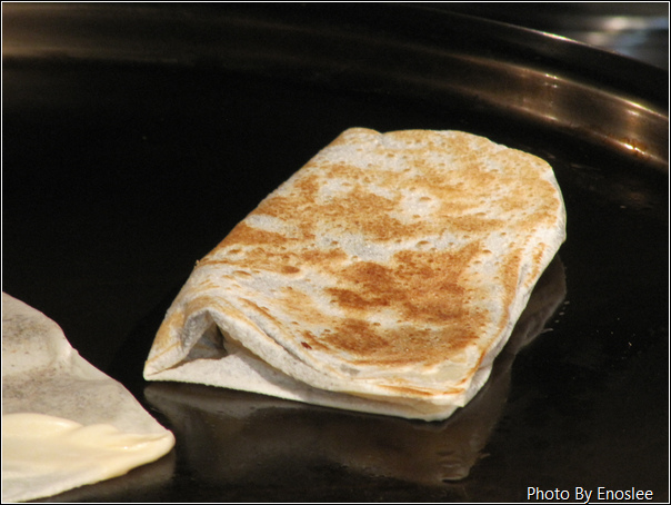 作好一片就是這樣薄薄的,裡面包你點的口味(例如:芝麻就是芝麻粉)