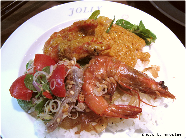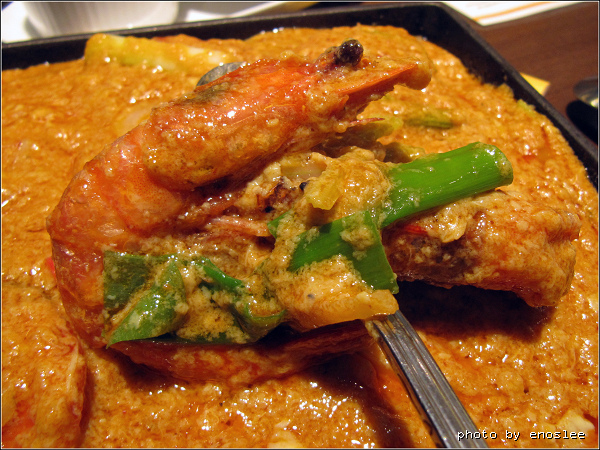 微辣的咖哩蝦(汶萊藍蝦、雞蛋、椰漿,與黃咖哩等香料一同快炒。)很好吃,配飯就可以先吃一碗了吧(飯可以一直加唷)
