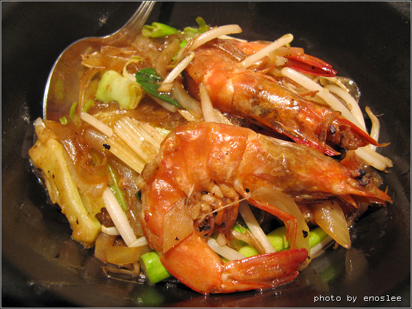 鮮蝦粉絲煲(汶萊藍蝦與冬粉、洋蔥等,加入由黑胡椒、花椒等香料製成之醬汁,一同於煲內燜煮。)
