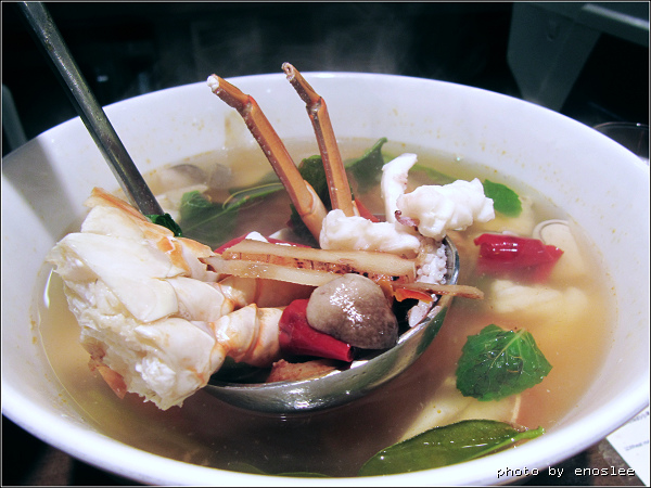 這泰式海鮮湯(新鮮螃蟹、汶萊藍蝦、花枝、鱸魚、加上香茅、南薑、乾辣椒等泰式香料熬煮,再以檸檬汁、魚露調味。),很酸但味道還不賴