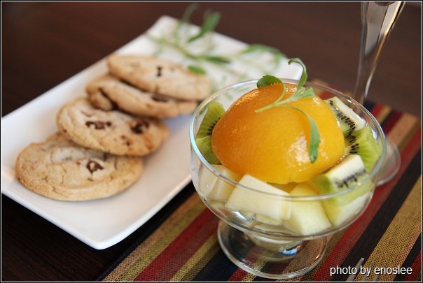 手工餅乾,進口水蜜桃罐的水果加上現切的奇異果跟蘋果