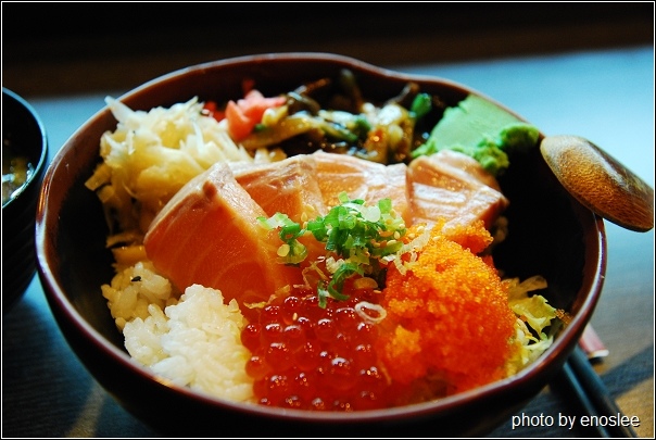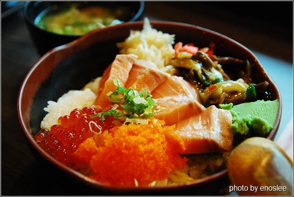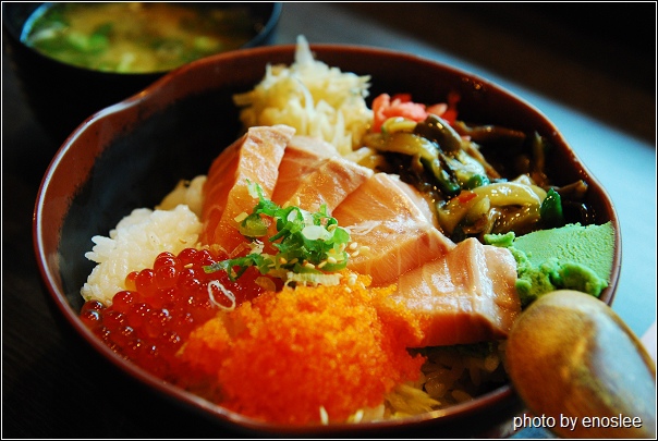 我的鮭魚親子丼上來啦!! 飯的部分要注意一下,點餐時,內用是熟飯,可以跟他說要醋飯,不過服務生是有主動詢問