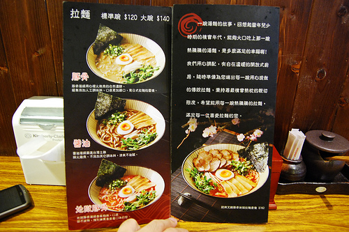某天在華山拍完照之後,要在附近找吃的,又不想吃速食店(如mos、吉野家),還要找個有冷氣吹的地方(當天中午實在有夠悶熱),本來第一家是個看起來不錯的日式烏龍麵,結果一進門,點元的歡迎光臨還沒說完,我們就又退出來了,因為冷氣不夠強.....囧, 於是又在附近晃了晃發現一家拉麵店,裝潢很有日本味,於是走近一觀.....門一開.."就是他了!!"(心口合一),冷氣超強啊!!