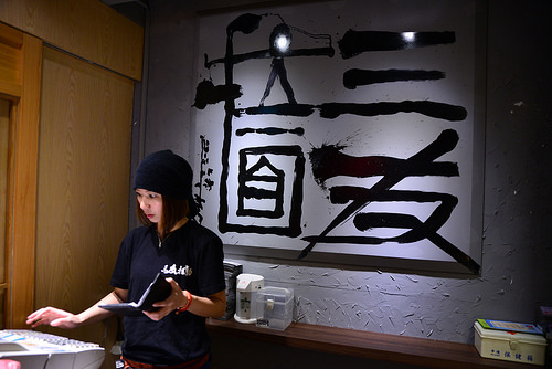 櫃台後牆有個用書法寫的三友拉麵的大看板