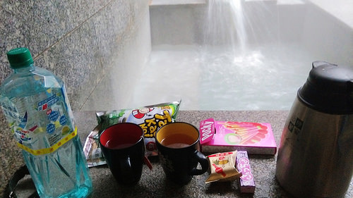 浴池不小,泡湯茶水不能少(還自備了一點點零食XD) 另外放了平版在泡湯池旁邊看影片(也太享受了)