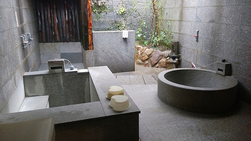 雙人SPA湯屋我覺得超大間啊! 左邊方形的是熱池,右邊圓形的是冷池,後面還有SPA水柱區,中間那小面牆的後面是廁所