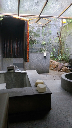 下面這張照片可以看到上面的透光棚頂,可以開啟或關上,算是半露天的,很有在大自然裡泡湯的感覺