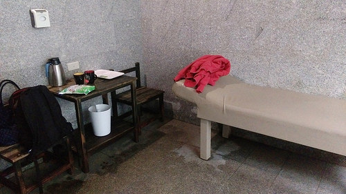 房間的另外一半有躺椅跟木桌椅可以使用,備有茶包跟咖啡包及熱水跟礦泉水