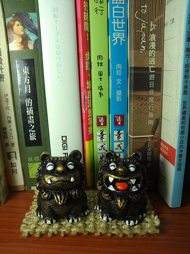 可愛的風獅爺放在電腦桌的書架上