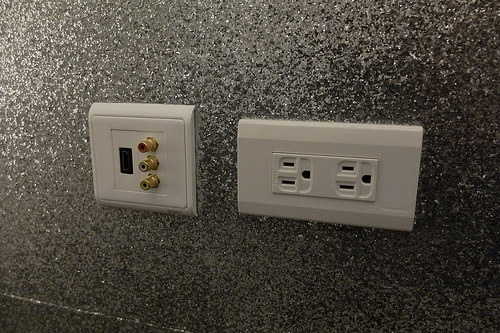 電視機底下的插座,可以插HDMI,不過好像沒辦法直接將USB插在電視機上,因為電視鑲在旋轉架子上,摸不到可以插的地方,想外接隨身碟看影片可能就沒辦法了