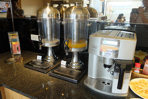 飲料區,牛奶跟果汁還有咖啡機(這台跟我公司的好像一樣),因為我比較晚到,所以飲料比較少了,後來他還有補上