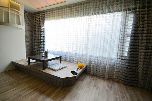 其實這層白紗窗簾後面它還有不透光的窗簾,所以想整個不讓光現近來也是可以的,打開後就是這樣光線充足