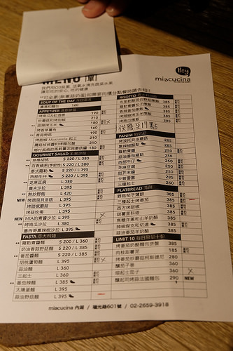 小小怨嘆一下之後,話說回來今天跟妹妹相約吃飯拿東西,就隨意找了這家miacucina餐廳,聽說別家分店的菜單比較多種菜色,好像也比較便宜一些不過用餐時間到餐廳還是滿座就是了,稍微紀錄一下今天吃了哪些東西